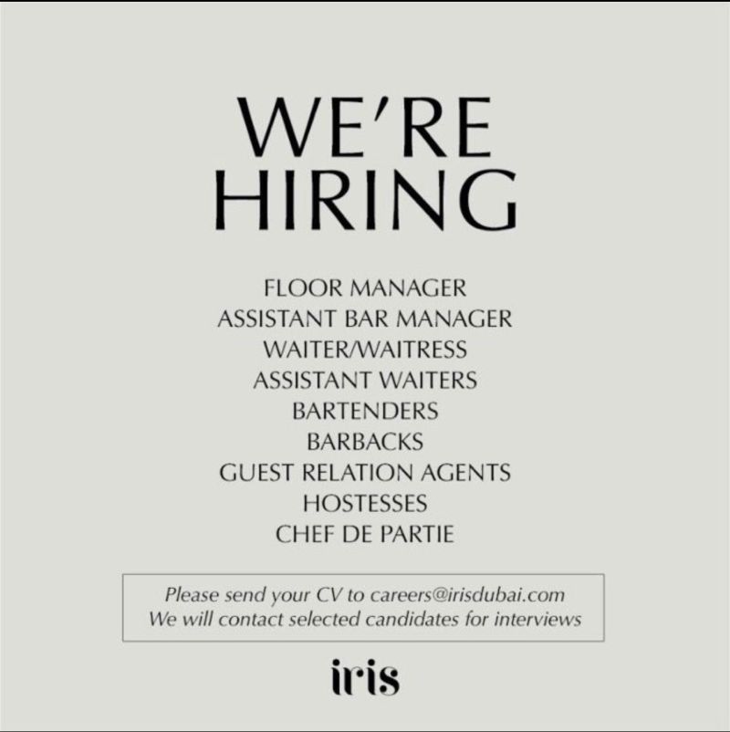 Iris Dubai, one of the leading dining and nightlife destinations in the city, is expanding its team! We are seeking dynamic and passionate individuals to join us in delivering exceptional experiences to our guests. If you have a flair for hospitality and are committed to providing excellent service, we invite you to apply for the following positions: