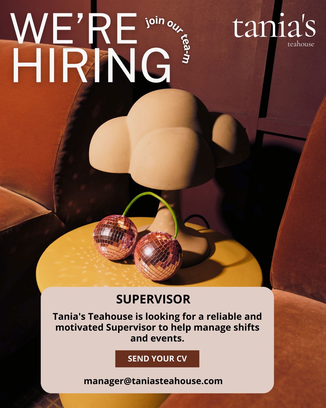 Please send your updated CV and a brief cover letter outlining your experience and why you’d be a great fit for this role to manager@Taniasteahouse.com.